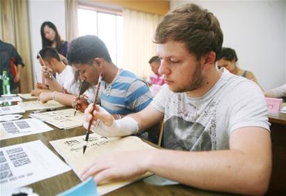 近日, 8名来自英国普利茅斯城市学院的学生在湖州师院学习中国书法,近距离感受中国传统文化。 记者王洁涵 摄