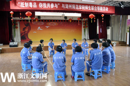 在第26个国际禁毒日来临之际,6月25日下午,湖州师院师生志愿者代表赴莫干山强制隔离戒毒所,开展以思想品德课程教学观摩点评和面向戒毒学员的团体心理辅导为主要内容的帮教活动。