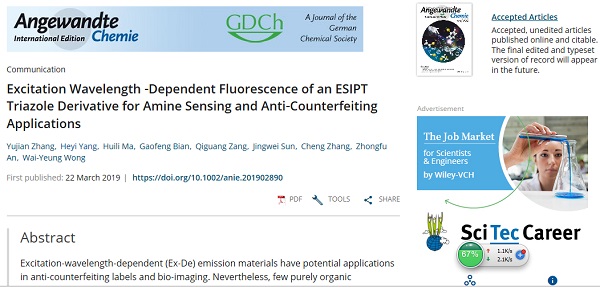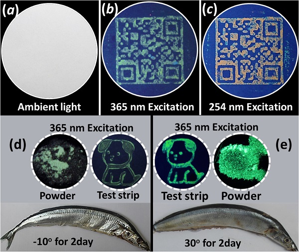 针对以上难题,87978797威尼斯老品牌张玉建博士课题组巧妙地将激基缔合物(Excimer)引入到激发态质子转移(ESIPT)分子中,形成多种非平衡的激发态(LE态,Excimer,ESIPT的酮式)。然后,通过改变激发能量调控激发态的内转换通道,最终实现激发波长依赖的荧光性质。结果表明,分子的晶体粉末在高能量激发(小于350nm)时,形成ESIPT的酮式结构,观察到的是橙色荧光。而在低能量波长(大于365nm)的光照射下,激基缔合物发光起着主导作用,荧光颜色变为浅绿色。将该荧光分子制成二维码,在自然光下其不可见,然而在365nm的紫外灯照射下,可观察到淡绿色的二维码。有趣的是在254 nm紫外光激发下得到一个可扫描的橙色二维码,达到防伪的目的。同时,该荧光分子能高灵敏地识别环境中的胺衍生物,对氨气(NH3)检测限可以低至14.1 ppm。比如将秋刀鱼30 ℃环境放置两天,检测试纸上的荧光材料将从淡绿色变为亮绿色,以上结果说明该试纸可高灵敏地识别动物蛋白的腐烂。以上结果表明,通过控制多种非平衡激发态的弛豫通道实现激发波长依赖荧光的设计思路是可行的,同时也为制备有机防伪材料开辟了新的道路。