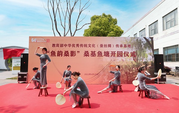 仪式最后,领导、嘉宾们一同参观了教育部中华优秀传统文化(蚕丝绸)传承基地“桑基鱼塘”、春(秋)蚕工作坊及剪纸表演。