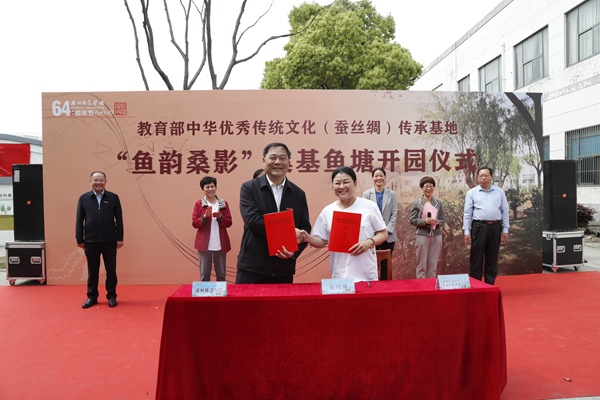 陈永华与徐敏利签订了共建蚕丝绸文化基地协议。根据协议,学校与湖州荻港徐缘生态旅游开发有限公司将在项目申报、活动举办、产品展示、学生创新创业等方面深化合作,更好地推进全球重要农业文化遗产湖州桑基鱼塘系统进高校与中华优秀传统文化(蚕丝绸)基地进社区,共同培植蚕丝绸文化的潜在“种子”,为蚕丝绸文化在浙江、全国乃至世界更好地传承和发展做出贡献。