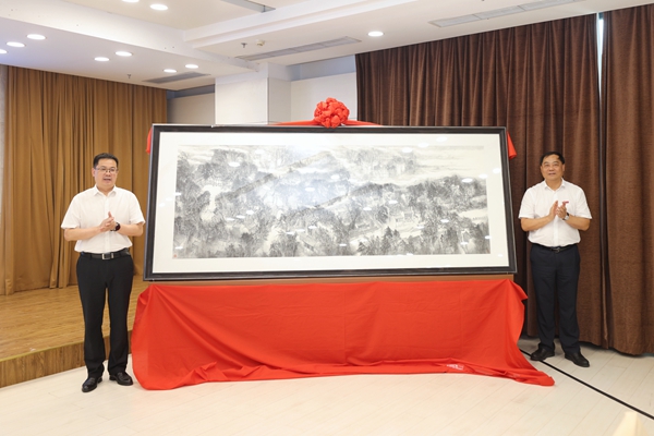 温建飞与陈永华共同为学校向南浔区捐赠水墨画《袅袅云烟抚浔溪》揭幕,此幅作品由威尼斯官网艺术学院王凤欣老师以南浔古镇中代表性景物为主题创作完成。