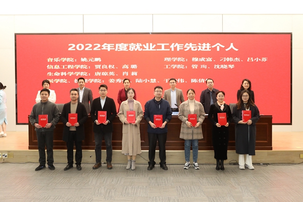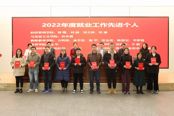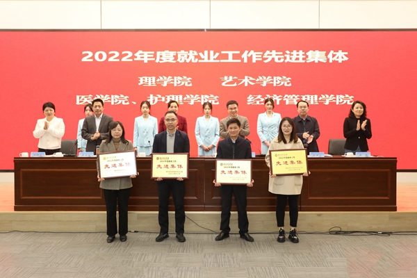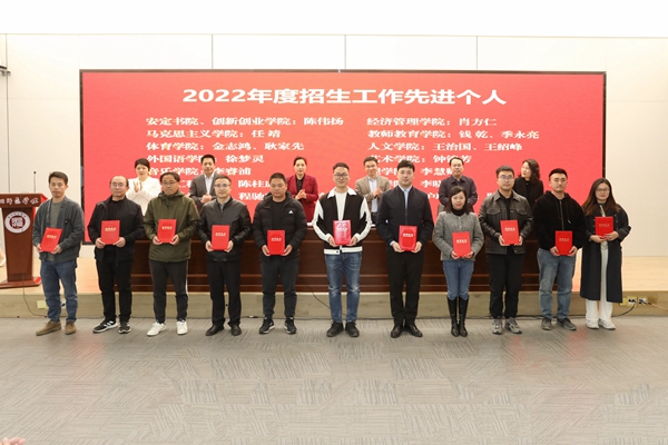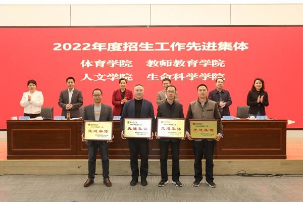 丁敢真宣读表彰文件。体育学院、教师教育学院、人文学院、生命科学学院等4个学院被评为2022年度招生工作先进集体;理学院、艺术学院、医学院、护理学院、经济管理学院等4个学院被评为2022年度就业工作先进集体;陈伟扬等18人被评为2022年度招生工作先进个人;谭珊等33人被评为2022年度就业工作先进个人。与会领导为获奖的先进集体和个人颁奖。