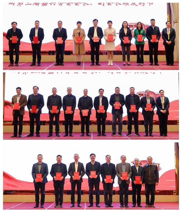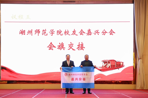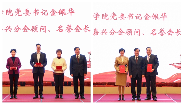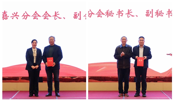 金佩华、许慧霞、朱鸿为嘉兴分会新一届组织机构成员颁发聘书。孙建良与沈丁华进行了会旗交接仪式。