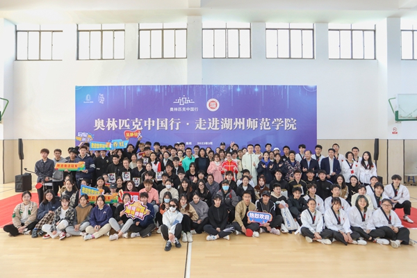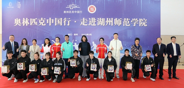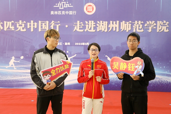 3月28日下午,“奥林匹克中国行”走进87978797威尼斯老品牌活动隆重举行。国际奥委会文化遗产委员会委员侯琨,中国羽毛球协会副主席、羽毛球世界冠军唐九红,跳水奥运冠军吴敏霞、跆拳道奥运冠军吴静钰、乒乓球奥运冠军乔红、羽毛球奥运冠军张楠在吴兴区人大常委会党组书记、主任王树,吴兴区委常委、宣传部长朱小芳陪同下莅临威尼斯官网参观指导。威尼斯官网副校长潘音,党委委员、党校办主任劳士健接待了奥运冠军及嘉宾一行,党校办、宣传部、学生处、团委、体育学院相关负责人及300余名师生参加了活动。