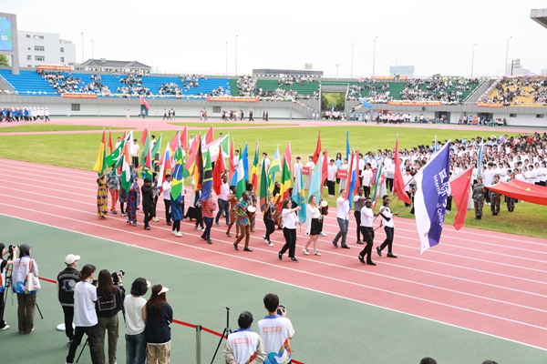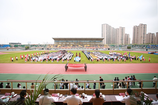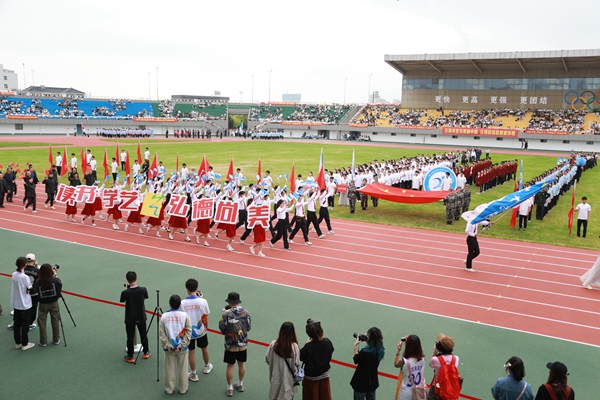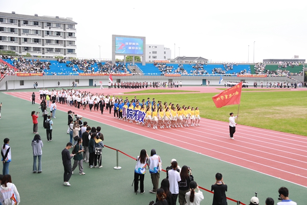伴随着雄壮的《运动员进行曲》,国旗护卫队、校运动会会徽队以及全体裁判员、运动员迈着整齐的步伐,精神饱满地步入运动场。各代表队的队列方阵依次走过主席台前,向师生们展现了各学院的靓丽风采。