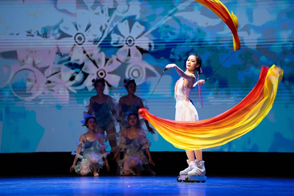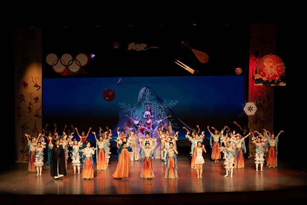 歌舞剧《“禾”梦一起飞》以“成长”为关键词,讲述了冬奥会花样滑冰运动员梦小禾和冰精灵一起穿越敦煌,遇到了一群准备演出的舞女,为摆脱困境,共同开启一段寻找九色鹿的奇幻之旅的故事。该剧集童话、神话于一身,充满了玄幻色彩,展现了“成长的道路并非一帆风顺,要敢于迎难而上,努力实现心中梦想”的道理。同时融入冬奥会、敦煌等古今元素,以浪漫主义的手法和焕然一新的舞台艺术风格,极大地丰富了儿童歌舞剧的艺术形式和内容,现场妙趣横生,掌声、笑声、欢呼声不断。