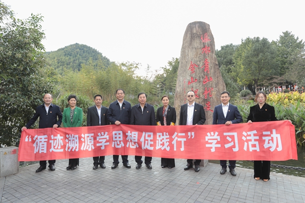 10月20日下午,校党委书记金佩华、校长许慧霞带领学校党委理论学习中心组全体成员走进安吉余村,沿着习近平总书记的足迹,开展“循迹溯源学思想促践行”研学活动,学习体悟习近平新时代中国特色社会主义思想在浙江的萌发与实践,通过现场学习进一步感受思想伟力、汲取真理力量。安吉县委副书记、县长宁云陪同。