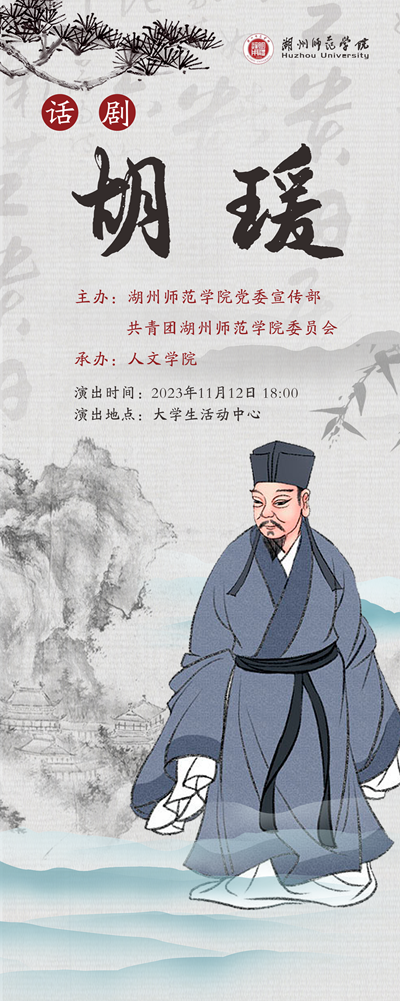 话剧《胡瑗》主要以胡瑗的生平为主线,讲述胡瑗从年少离家求学,到传道授业,最终成为“四方之士云集受业”的胡先生。特别是其在湖州州学任主讲教授期间,提出了“致天下之治者在人才,成天下之才者在教化,教化之所本者在学校”的至理名言,并创立了卓有成效的教育思想——“湖学”。