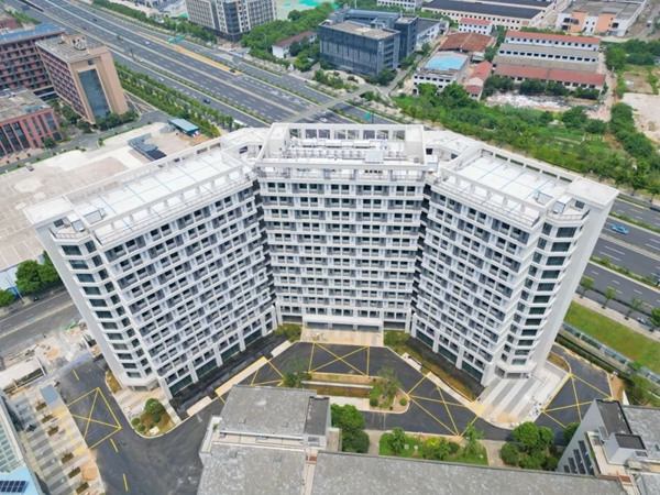 新建成的研究生公寓楼位于学校东校区,建筑整体呈开口朝南的元宝形,与南侧已建宿舍楼形成围合。建筑面积30429.23平方米,地上13层,地下1层。有590间公寓,可容纳2356人。配套生活服务中心在研究生公寓楼南侧,建筑面积2692.47平方米,地上3层。