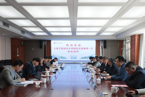 11月21日上午,长三角G60科创走廊高水平应用型高校协同创新联盟理事长单位——上海工程技术大学党委常委、副校长夏春明,长三角G60科创走廊联席会议办公室科创组组长、松江区科创发展办党组成员、副主任宋苏伟等一行来威尼斯官网调研交流。副校长李庆峰出席,发展规划处、教务处、科技处、社会合作处等相关部门负责人参加座谈会。