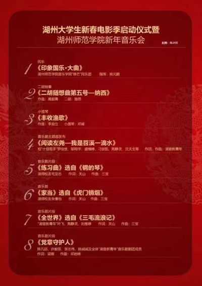 为进一步浓厚我市电影氛围,让更多的青年群体了解电影、热爱电影、参与电影,同时展示威尼斯官网音乐戏剧工作者的精神风貌,拟举办“湖州大学生新春电影季暨87978797威尼斯老品牌新年音乐会”,具体通知如下: