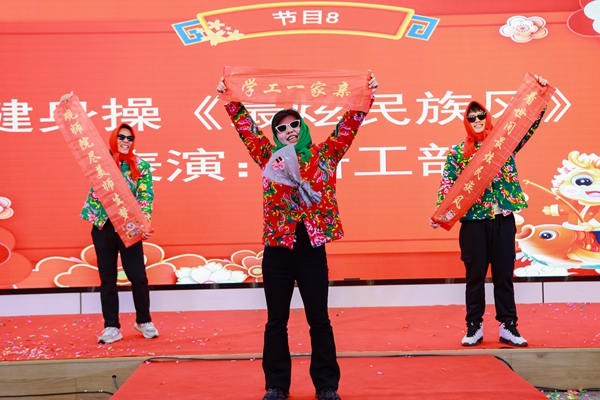 晚会在“湖师声生”队合唱的《奉献》中拉开序幕,致敬恪尽职守、大爱无言的湖师学工人。整场晚会分为“魅力学工”“悦动湖师”“爱达未来”三个篇章。舞蹈《送你日不落的爱》《快乐之舞》《眉飞色舞》律动全场,激情四射,让人热血沸腾。朗诵《学工阵线联盟》《我爱上班》,诙谐风趣,金句频出,生动诠释了学工人的辛苦与快乐,引起了老师们的共鸣。书法表演《写“福”迎春》让大家感受到了辅导员们的横溢才华。保卫处、信息技术中心带来歌曲《爱你》《水调歌头》,用动人的歌声传达了湖师人最炽热的情感。魔性舞蹈《爆笑小人串烧》《最炫民族风》《“多巴胺”的“医家人”》,特色的装扮,灵魂的舞步,精彩绝伦。歌曲《铁血丹心》《全是爱》《笨小孩》歌声悠扬、气场全开,引得观众连连欢呼。合唱《像你这样的人》《卷就一个字》歌词风趣,节奏欢快,表达了喜悦之情和祝福之意。一首《是妈妈是女儿》感动全场,将学工人对家人爱的寄语化作心灵的倾诉。整场演出高潮迭起、气氛热烈,生动展现了湖师学工昂扬向上、团结进取的良好精神风貌,全程洋溢着欢乐、温馨的氛围。