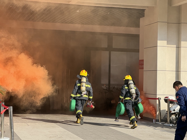 活动中,安保人员在接到火警后第一时间赶赴现场,楼内师生在引导员的组织下沉着应对,迅速、有序地疏散至室外安全区域。校内消防应急救援队人员在1分钟内到达现场用灭火器和室内消火栓进行灭火演练。接到报警的飞英消防救援站人员迅速赶至“事发地点”,在学校安保人员的通力协作下,铺设水带灭火,利用云梯等救出“被困”人员。