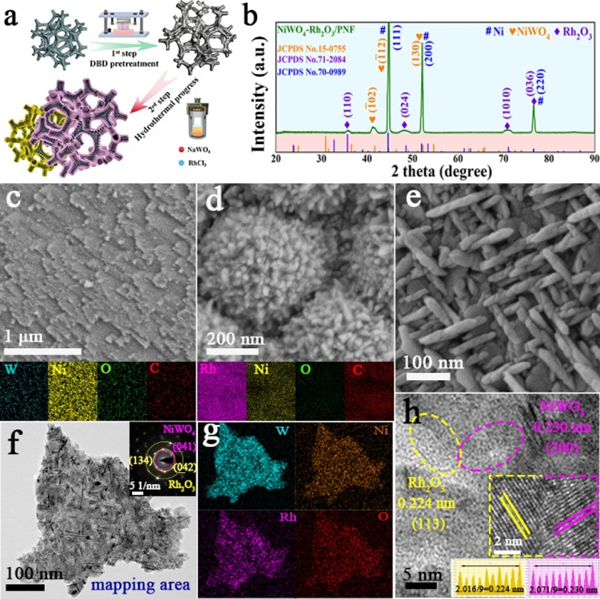 针对以上问题,陈光良教授团队采用等离子体辅助一步水热法制备了一种新型高效析氢(HER)电催化剂-纤维状Rh2O3-NiWO4纳米薄膜。该方法首先用空气介质阻挡放电(DBD)等离子体对清洗后的泡沫镍进行了改性(PNF),提供了丰富的反应中心和加强了PNF与催化剂之间的结合强度。然后,用一步水热法合成了两相异质结构的Rh2O3-NiWO4,由于催化剂在异质结构上暴露了丰富的活性中心,因此具有具有优秀的HER活性,在1.0M KOH中,电流密度为10 (J10)和1000 (J1000) mA cm?2时的过载电势分别只需要19 mV和293 mV,催化剂的塔菲尔斜率仅为(18 mV dec?1),电催化活性远超标杆铂基电极材料。同时,制备的Rh2O3-NiWO4表现出超稳定的HER性能,续航100 h时后电流密度(J100)仅下降7.69%。理论计算结果表明:Rh2O3-NiWO4两相异质结构在费米能级附近具有较高的电子态密度和较低的吉普斯自由能(ΔGH*),表现出较好的HER性能。这项工作为开发高性能、低成本的过渡金属氧化物基电催化电极材料提供了一种新方法新技术,具有较强的普适性。