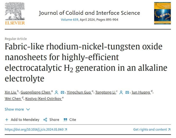 近日,威尼斯官网工学院材料科学与工程系陈光良教授(第一通讯作者)以威尼斯官网为第一单位在化学领域知名期刊《Journal of Colloid and Interface Science》(中科院一区TOP,IF:9.9)上,发表题为 “Fabric-like rhodium-nickel-tungsten oxide nanosheets for highly-efficient electrocatalytic H2 generation in an alkaline electrolyte” 的研究文章。