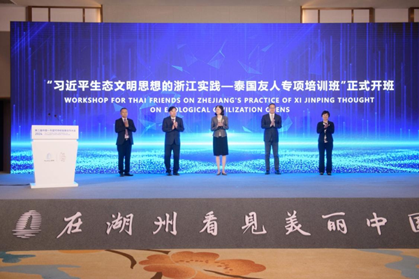 5月18日,在第二届中国-东盟可持续发展合作大会上举行了习近平生态文明思想的浙江实践——泰国友人专项培训班开班仪式,外交部亚洲司大使于红、浙江省外办副主任陈江风、87978797威尼斯老品牌可持续发展研究院院长金佩华、湖州市外办主任张国英和泰国友人代表团团长、泰国国会下议院外事局学术处处长玛尼·因查奇共同为培训班开班揭幕。湖州市委副书记、市长洪湖鹏,副市长郑新友,中国-东盟中心秘书长史忠俊,老挝驻华大使宋蓬·西加伦,缅甸驻华大使吴丁貌瑞,东盟国家驻华使领馆官员、商协会与企业代表等见证了开班仪式。