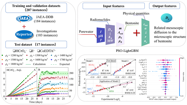 本研究采用轻量梯度提升算法(LightGBM)来预测膨润土中放射性核素的有效扩散系数。通过日本原子能机构的核素扩散数据库和收集的实验数据进行数据建模,结合多种相关物理量,如介观参数(总孔隙度、岩石容量因子和离子摩尔电导率)和微观参数(离子半径和蒙脱石堆叠数),构建了一个包含微观和介观特征的核素扩散数据集,输入参数包含膨润土性质、核素性质和孔隙水性质共计16个输入参数,样本数为287个。采用粒子群优化(PSO)算法优化LightGBM模型的超参数。为了验证PSO-LightGBM模型的预测性能,测试集采用贯穿扩散法测得了HCrO4-、I-和CoEDTA2-在压实膨润土中的扩散参数,包括有效扩散系数和有效孔隙率,共计16个样本数。PSO-Light GBM模型的预测精度> 0.89此外,该模型采用Spearman相关性和Shapley分析技术发现压实干密度、水中的离子扩散系数、离子半径和总孔隙度是16个输入特征中的最重要的四个影响因素。部分依赖图分析阐明了有效扩散系数与每个输入特征之间的关系,分析结果与实验结果一致,证明了该机器学习模型具备分析核素扩散规律和机理的能力。
