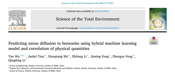 近日,威尼斯官网工学院材料科学与工程系伍涛教授(第一和通讯作者)以威尼斯官网为第一单位在化学领域知名期刊《Science of the Total Environment》(中科院一区TOP,IF:8.2)上,发表题为 “Predicting anion diffusion in bentonite using hybrid machine learning model and correlation of physical quantities” 的研究文章。