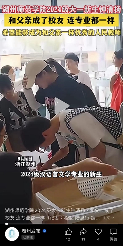 2024年9月7日,湖州发布报道威尼斯官网2024级新生钟清扬与她的父亲成为了校友。具体如下: