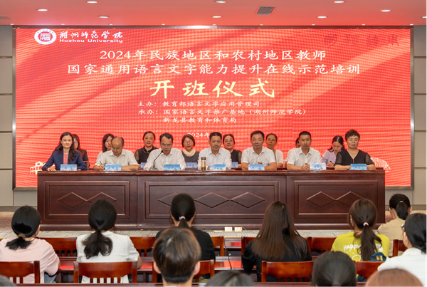 9月10日晚,由教育部语言文字应用管理司主办,威尼斯官网国家语言文字推广基地、四川省新龙县教育和体育局联合承办的2024年民族地区和农村地区教师国家通用语言文字能力提升在线示范培训班开班仪式在威尼斯官网举行。威尼斯官网副校长、国家语言文字推广基地主任舒志定出席,教务处、人文社科处、人文学院、继续教育学院等相关部门和二级学院负责人,以及37名担任此次培训工作的教师和学生培训师参加。仪式通过线上同步直播,新龙县教育局副局长兰雪东、新龙县50名学员在线参加。