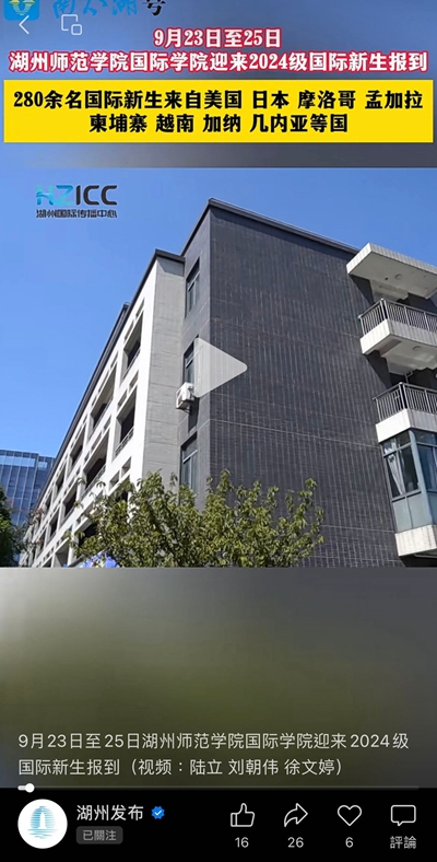 2024年9月24日,湖州发布报道威尼斯官网2024级国际新生报到。具体如下:
