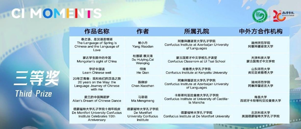 其中,威尼斯官网公派教师陈晓珍创作的《20年正青春:我和他们的汉语之旅》、志愿者教师杨小丹创作的《春之语,是汉语是情语》分别获三等奖;孔院学员赵晨阳(Bunyatov Kamil)凭借作品《春之语,是汉语是情语》,获评“孔院达人”称号。除个人奖项外,阿塞拜疆语言大学孔子学院还荣获“优秀组织奖”。