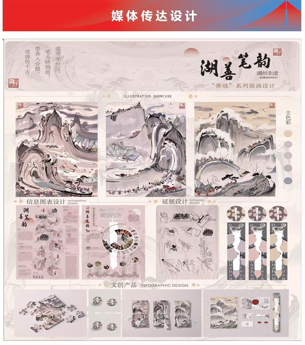 近年来,艺术学院高度重视研究生创新实践能力的培养,专门成立了研究生学科竞赛管理与指导团队,有针对性地物色竞赛人选,提前孵化竞赛项目。本次获得一等奖的金靖怡团队,在指导老师李志刚教授的指导下,提交了“善琏”湖笔为主题的非遗系列插画作品。作品以浙江湖笔文化为中心进行发散,提取湖笔、湖笔制作过程、国画等元素作为设计基础,以插画、信息图表以及文创延展来展现,围绕“美丽中国”的主题进行设计。作品继承和发展了美丽中国的非遗文化,并向观众们传达了这一理念:无论时代如何发展,传统的书画用材永远是我们宝贵的文化财富。在不断创新的现代设计中,可以通过将现代的元素与传统非遗相结合,用插画去介绍非遗的制作过程,用信息可视化去介绍湖笔的原料、发展和历史故事等。