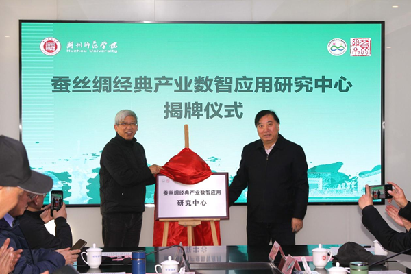 在热烈的氛围中,金佩华与赵丰共同为研究中心揭牌。赵丰在讲话中指出,湖州作为丝绸之源,具备独特的优势,蚕丝绸经典产业数智化应用具有广阔的前景。
