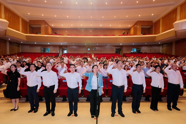 面向鲜红的党旗,校党委书记许慧霞带领师生党员重温入党誓词。