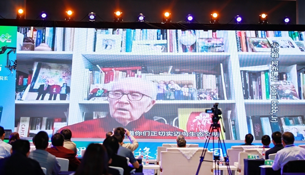 小约翰·柯布院士在视频致辞中对主办方的邀请表示感谢,他表示,此次活动是庆祝世界地球日的一个良好方式。近年来的多次走访中国,见证了中国的巨大变化和生态文明建设的进步。中国向世界展示如何走向生态文明和满足所有生物共同利益的道路,很多国家和人民都会心怀感激地追随。如果世界上有一个能够领导人类走向有机生态文明的国家,那就是中国。