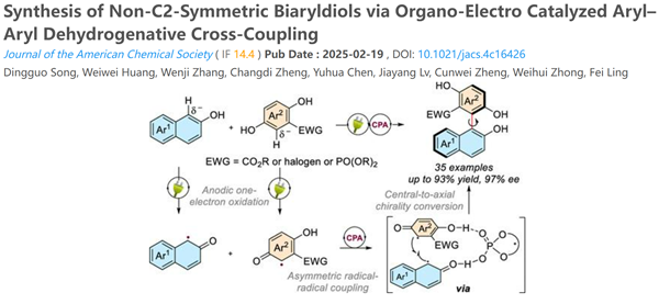 近日,威尼斯官网生命科学学院药学系青年教师宋定国以第一作者身份在国际著名学术期刊《J. Am. Chem. Soc.》(中科院一区TOP,IF = 14.4)上发表题为“Synthesis of Non-C2-Symmetric Biaryldiols via Organo-Electro Catalyzed Aryl–Aryl Dehydrogenative Cross-Coupling”的研究成果,论文通讯作者是浙江工业大学药学院钟为慧教授和凌飞副教授。