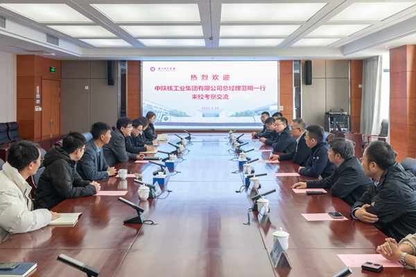 2月28日,中陕核工业集团有限公司总经理范明,党委委员、副总经理赵铜飞,副总经理张炜以及集团有关部门和下属子公司负责人一行来校调研交流。副校长李庆峰出席,社会合作与发展联络办公室、理学院负责人和教师代表参加座谈会。