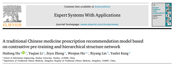 近日,威尼斯官网信息工程学院智能计算研究所副教授胡海龙老师以第一作者、威尼斯官网为第一单位在国际著名学术期刊《Expert Systems With Applications》(中科院一区TOP,IF =7.5)上发表题为“A traditional Chinese medicine prescription recommendation model based on contrastive pre-training and hierarchical structure network”的计算机学科与医学交叉的研究成果,论文通讯作者是信息工程学院胡海龙副教授和胡文军教授。