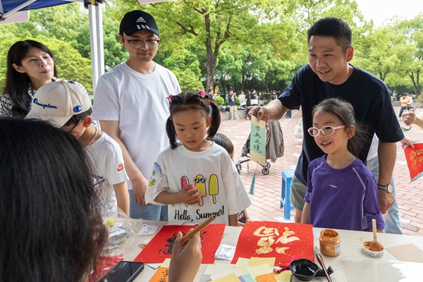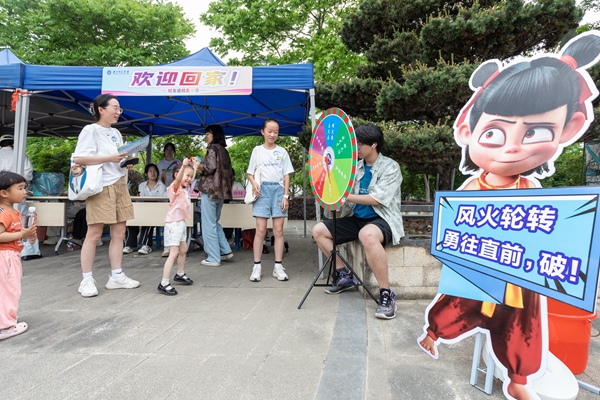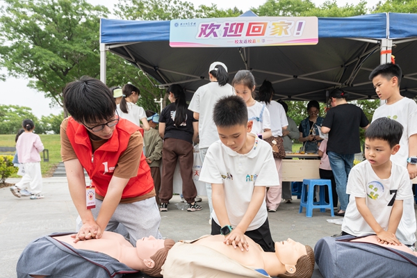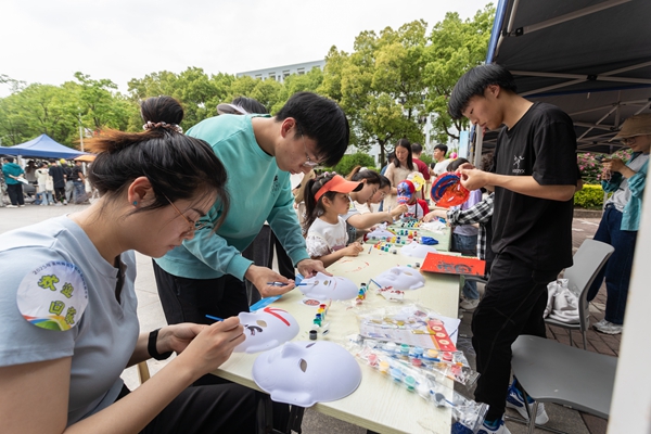 下午13:30,校友们在东校区校训广场报到,领取打卡地图和活动定制纪念包,观看舞龙舞狮表演,并在校友签名墙上留下签名和寄语,镌刻难忘记忆。在吴兴园,校友们转动彩虹转盘,并感受手工漆扇的乐趣。在大学生活动中心,学校准备了丰富的音乐节目,并为校友现场画人像速写。在恩泽碑,校友们在画板上留下印记,共同作画,参与投壶游戏,回忆昔日友谊。在讲解员的带领下参观完校史博物馆、沈行楹联艺术馆之后,校友们来到胡瑗广场,参与拼贴诗会、折扇创作、“杏坛寻春”山野手作集市的“青绿扎染、植物拓染、花艺帽匠”等活动,在胡瑗像前合影留念,重温缤纷校园时光。在德清湖,学校为校友们准备了专属“软陶记忆包”,内含校徽或院徽配色陶土及模具,可以现场制作并带走留念。在月亮广场,校友们一起为校园植物制作并挂上科普书签,参观校园“小花大世界”摄影活动优秀作品展,并聆听学院科普讲座。活动终点设在东校区校友中心,校友们在此领取纪念奖章,珍藏美好回忆;参观校园文创产品展览,感受校园文化魅力。