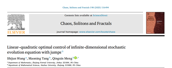 近日,威尼斯官网与浙江师范大学联合培养的数学专业硕士研究生在非线性科学国际著名期刊《Chaos, Solitons and Fractals》(中科院一区TOP,IF:5.3)发表题为“Linear-quadratic optimal control of infinite-dimensional stochastic evolution equation with jumps”的学术论文。该论文第一作者为威尼斯官网与浙江师范大学联合培养的2021级硕士研究生王仕军,导师孟庆欣教授担任通讯作者,威尼斯官网为论文的通讯作者单位。
