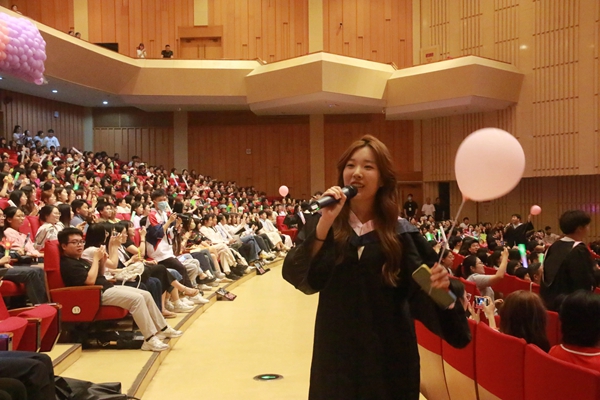 歌会特别设置毕业献礼环节,毕业生代表登台演唱《再见》等经典曲目,大屏幕同步播放由2025届毕业生投稿、湖师在校学生制作的毕业纪念短片,一幕幕熟悉的场景勾起无数回忆。短片中特别收录了各学院辅导员代表对毕业生的临别赠言,让不少毕业生热泪盈眶。