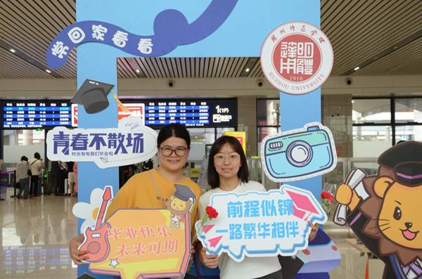 校党委副书记丁敢真到湖州站送别毕业生并看望慰问志愿者。志愿者们以饱满的热情和周到的服务帮助毕业生搬运行李,分发矿泉水和编织花束,并送至出发站台。在场老师与毕业生温暖拥抱,为他们送上美好祝愿。在志愿者的引导下,毕业生们纷纷在毕业相框处合照打卡,从“湖师站”启程至“未来站”。