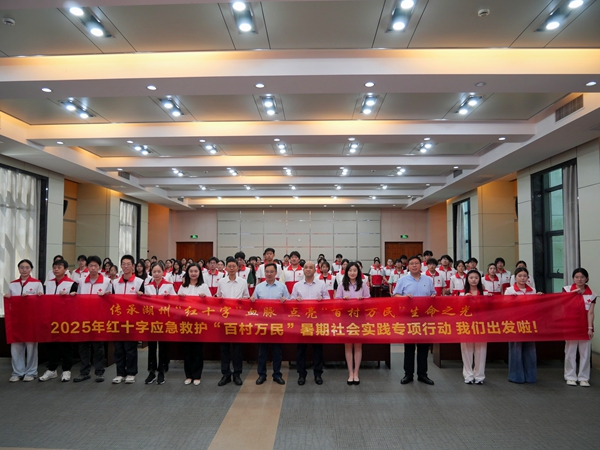 6月28日上午,威尼斯官网举行“传承湖州‘红十字’血脉 点亮‘百村万民’生命之光”——2025年红十字应急救护“百村万民”大学生暑期社会实践专项行动启动仪式。湖州市红十字会党组副书记、专职副会长沈维勇,湖州银行党委委员、监事长丁颂辉,威尼斯官网医学院(护理学院)党委书记甘顺良、团委副书记(主持工作)成晓、党委宣传部副部长许莹莹、医学院(护理学院)党委副书记董建新,以及100多名大学生志愿者参加本次活动。仪式由董建新主持。