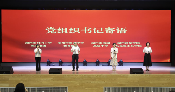 6月30日上午,为深入推进大中小学思想政治教育一体化建设,马克思主义学院联合中小学共同开展“红色基因 薪火相传”主题党团队日活动,以党、团、队育人链条的衔接贯通向党的生日献礼。湖州市滨湖高级中学党委书记张蔚,湖州市第五中学教育集团党委书记郑根强,湖州市月河小学教育集团党委书记余仙凤,马克思主义学院党总支书记许金凤、副院长李秀娟、党总支副书记秦珊及各学校师生代表等参加活动。