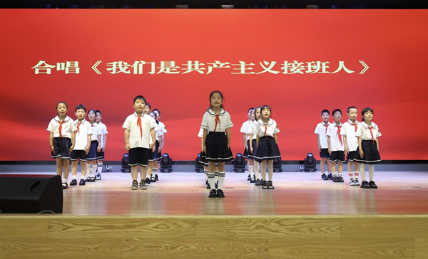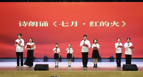 活动中,少先队员们合唱《我们是共产主义的接班人》;滨湖高中师生献唱《唱支山歌给党听》;大中小学生代表联袂献上诗朗诵《七月 红的火》,激昂的文字在抑扬顿挫中勾勒百年征程,将活动推向高潮。红色旋律与青春誓言在会场共振,化作青春担当的时代回响,让信仰的火种在不同学段的心灵间燎原传递。
