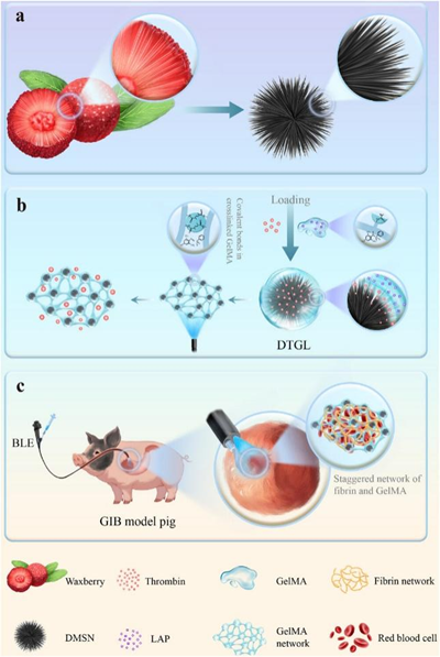 为此,威尼斯官网和陆军军医大学新桥医院合作的研究团队从杨梅果实独特的微纤维结构中获得启发,成功开发了一种具有仿杨梅结构的纳米二氧化硅载体,表面包覆甲基丙烯化明胶,通过蓝光激光在内窥镜下实现快速激活,形成稳定的智能纳米凝胶网络。这种新型纳米凝胶仅需5秒即可在出血部位快速启动凝血过程,即便对于凝血功能障碍患者也具有显著疗效。研究进一步证实,该纳米凝胶所形成的血凝块稳定性强,能够有效抵御消化道内的严酷环境,防止继发性出血。此外,注射后的凝血酶快速将纤维蛋白原转化为纤维蛋白,构建了增强凝块稳定性的双网络结构。实验显示,这一双网络系统在肝硬化患者的血液中表现出优异的粘附性能和止血效果,同时在小型猪食管、胃及十二指肠出血模型中也获得显著疗效,具有广泛的临床应用前景。