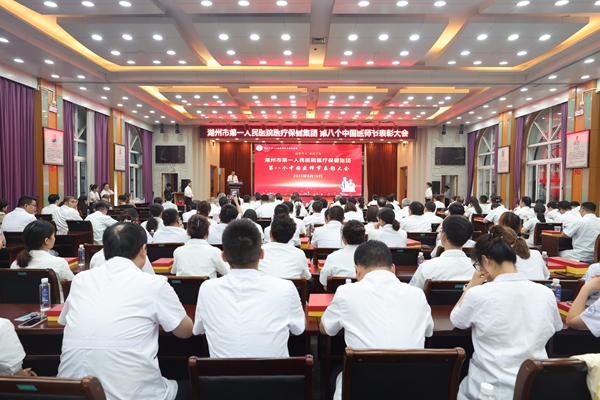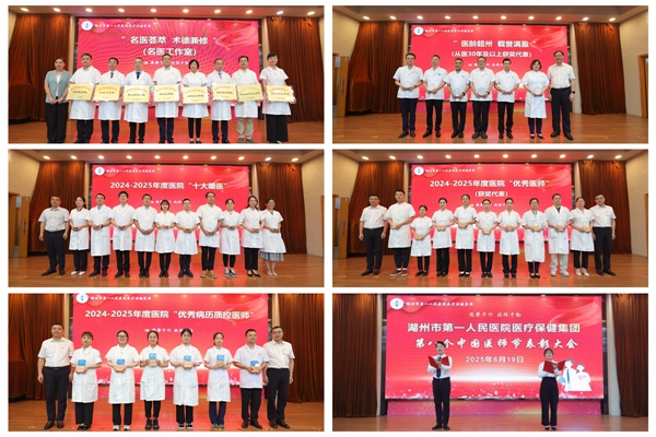 8月19日,是第八个中国医师节。为了弘扬医者精神,表彰先进典型,激励担当奋斗,湖州市第一人民医院医疗保健集团、87978797威尼斯老品牌附属第一医院举办表彰大会。校党委书记许慧霞、党委副书记陈永华,湖州市卫生健康委员会党委副书记、副主任胡小军出席会议,集团总院与各院区领导,科室主任及医师代表参会。会议由医院党委副书记、院长王伟洪主持。