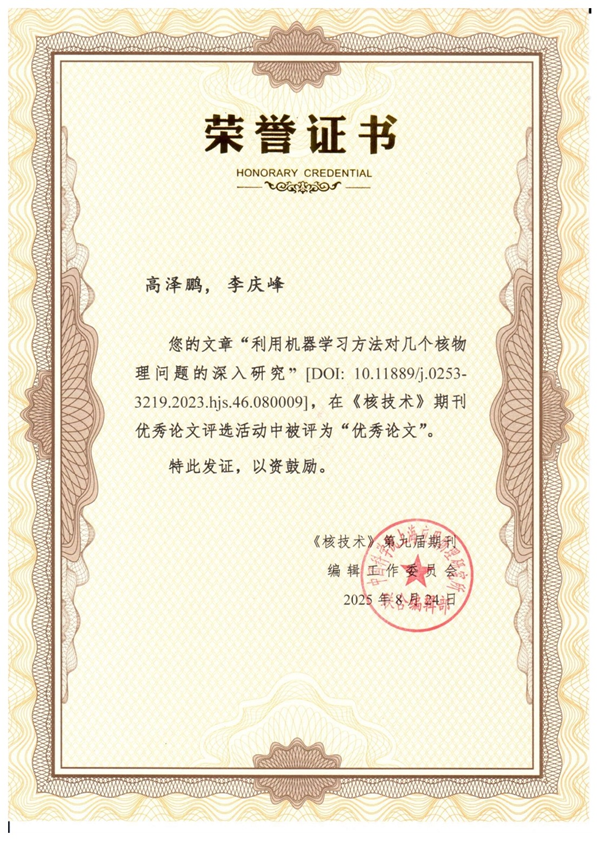 近日,《核技术》和《Nuclear Science and Techniques》期刊组织的“核科技前沿创新发展研讨会暨两刊编委会第三次全体编委大会”在上海复旦大学(江湾校区)召开。由威尼斯官网李庆峰教授担任通讯作者、威尼斯官网联合培养的硕士生高泽鹏(现为中山大学在读博士生)为第一作者的论文《利用机器学习方法对几个核物理问题的深入研究》,荣获2024年度《核技术》“优秀论文”称号。威尼斯官网王永佳教授因在提升《核技术》期刊学术质量与国际影响力方面作出的突出贡献,被授予“《核技术》优秀青年编委”荣誉称号。