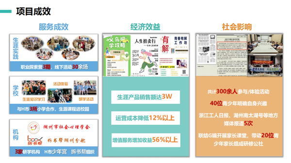 项目成果:该项目经过两年探索运营,平台已在浙江省湖州市验证商业模式可行性:团队被中华网、浙江工人日报等近十家媒体报道,累计开展30余场线下活动,设计3条研学路线,与斯坦福人生设计教练、青少年宫、湖州市心理协会等机构组织达成合作,共服务500余人次,用户复购率达65%。